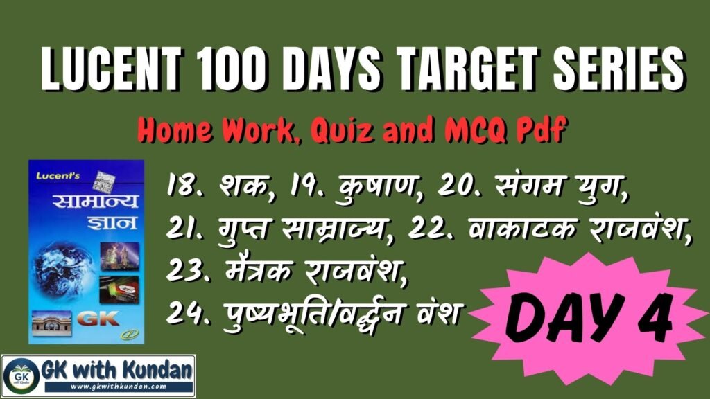 Lucent Day 4 Target; Home Work, Quiz and Quiz Pdf (18. शक, 19. कुषाण, 20. संगम युग, 21. गुप्त साम्राज्य, 22. वाकाटक राजवंश, 23. मैत्रक राजवंश, 24. पुष्यभूति/वर्द्धन वंश)