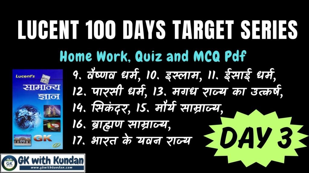 Lucent Day 3 Target; Home Work, Quiz and Quiz Pdf (9. वैष्णव धर्म, 10. इस्लाम, 11. ईसाई धर्म, 12. पारसी धर्म, 13. मगध राज्य का उत्कर्ष, 14. सिकंदर, 15. मौर्य साम्राज्य, 16. ब्राह्मण साम्राज्य, 17. भारत के यवन राज्य)