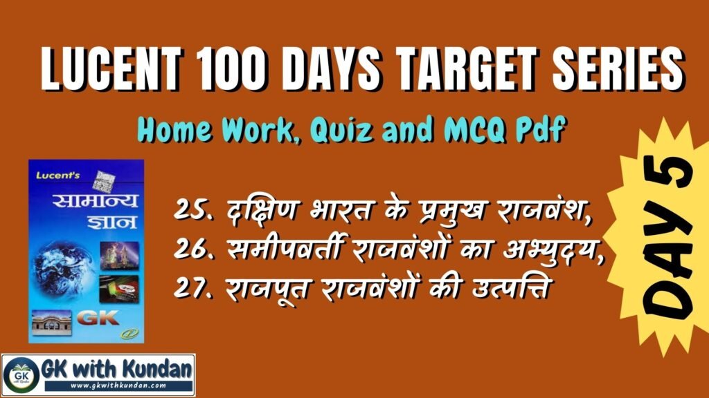 Lucent Day 5 Target; Home Work, Quiz and Quiz Pdf (दक्षिण भारत के प्रमुख राजवंश, 26. समीपवर्ती राजवंशों का अभ्युदय, 27. राजपूत राजवंशों की उत्पत्ति)