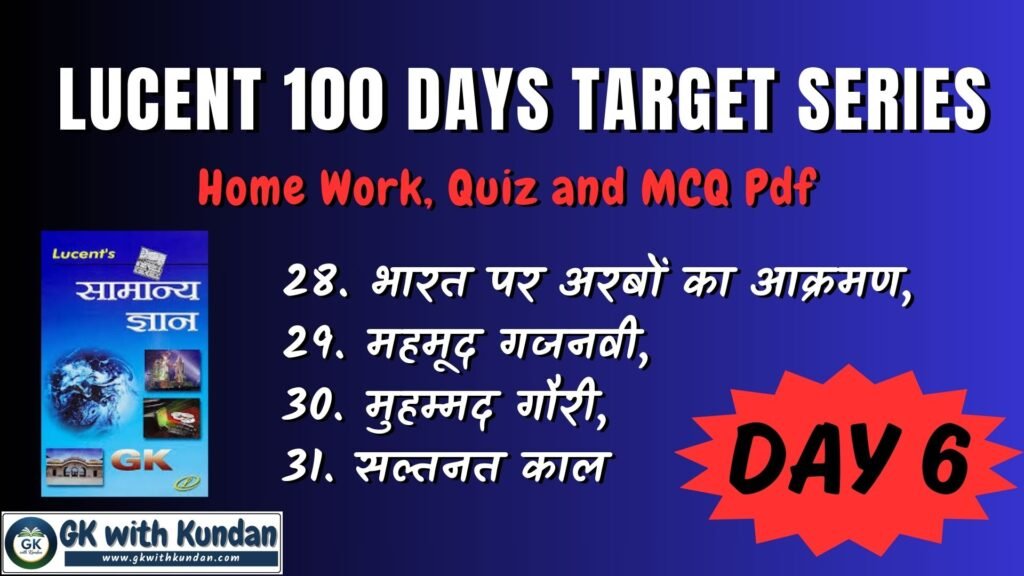 Lucent Day 6 Target; Home Work, Quiz and Quiz Pdf (28. भारत पर अरबों का आक्रमण, 29. महमूद गजनवी, 30. मुहम्मद गौरी, 31. सल्तनत काल)