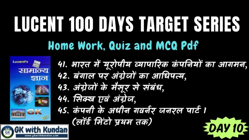 Lucent Day 10 Target; Home Work, Quiz and Quiz Pdf (41. भारत में यूरोपीय व्यापारिक कंपनियों का आगमन, 42. बंगाल पर अंग्रेजों का आधिपत्य, 43. अंग्रेजों के मैसूर से संबंध, 44. सिक्ख एवं अंग्रेज, 45. कंपनी के अधीन गवर्नर जनरल पार्ट 1)